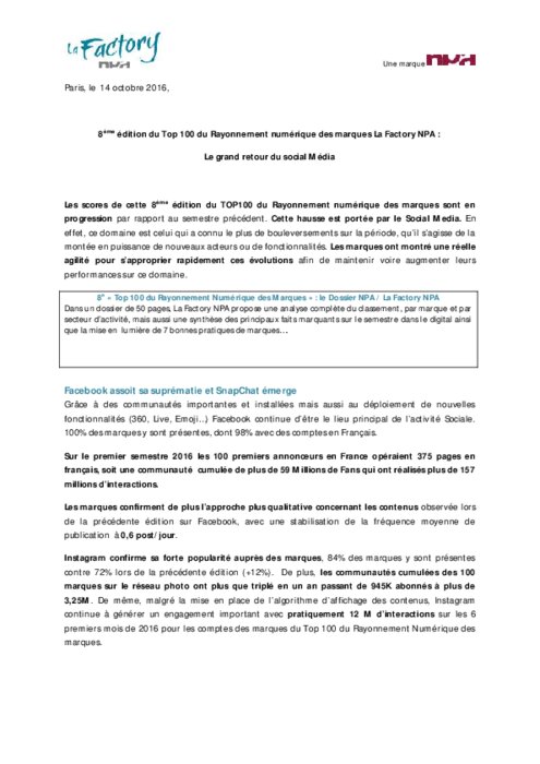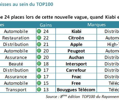 Les scores de cette 8ème édition du TOP100 du Rayonnement numérique des marques sont en progression par rapport au semestre précédent. Cette hausse est portée par le Social Media. En effet, ce domaine est celui qui a connu le plus de bouleversements sur la période, qu’il s’agisse de la montée en puissance de nouveaux acteurs ou de fonctionnalités. Concernant le secteur automobile, Hyundai est la marque qui a gagné le plus grand nombre de places lors de cette 8ème édition.