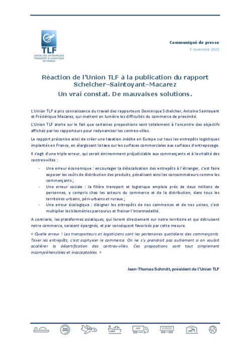 Services 05 novembre 2025 - 15:41 L’Union TLF a pris connaissance du travail des rapporteurs Dominique Schelcher, Antoine Saintoyant et Frédérique Macarez, qui mettent en lumière les difficultés du commerce de proximité. PDF (276 Ko) Télécharger credit TLF