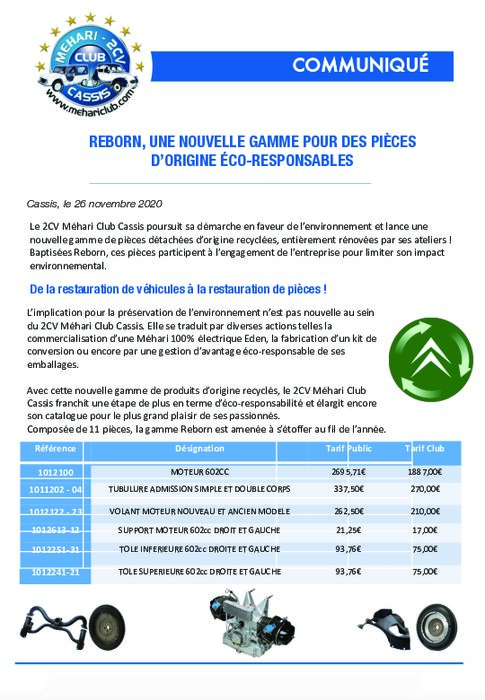 Le 2CV Méhari Club Cassis poursuit sa démarche en faveur de l’environnement et lance une nouvelle gamme de pièces détachées d’origine recyclées, entièrement rénovées par ses ateliers ! Baptisées Reborn, ces pièces participent à l’engagement de l’entreprise pour limiter son impact environnemental. De la restauration de véhicules à la restauration de pièces !