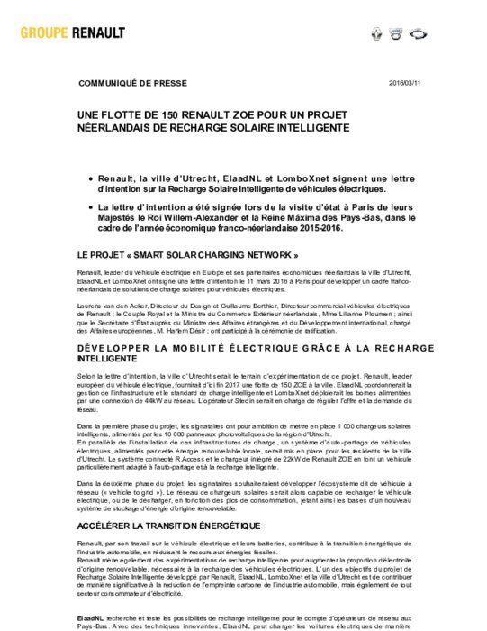 Renault, la ville d’Utrecht, ElaadNL et LomboXnet signent une lettre d’intention sur la Recharge Solaire Intelligente de véhicules électriques. La lettre d’intention a été signée lors de la visite d’état à Paris de leurs Majestés le Roi Willem-Alexander et la Reine Máxima des Pays-Bas, dans le cadre de l’année économique franco-néerlandaise 2015-2016.
