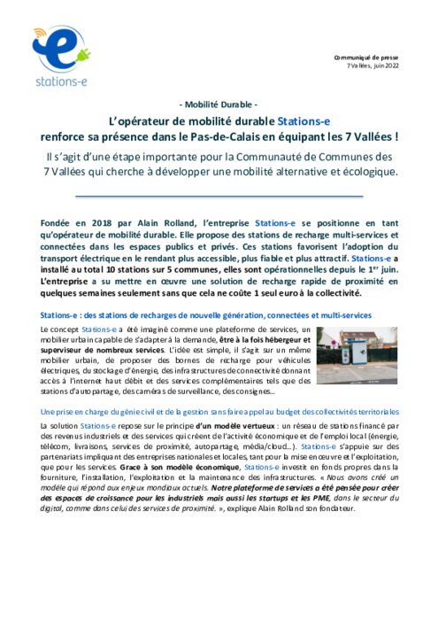 Fondée en 2018 par Alain Rolland, l’entreprise Stations-e se positionne en tant qu’opérateur de mobilité durable. Elle propose des stations de recharge multi-services et connectées dans les espaces publics et privés. Ces stations favorisent l’adoption du transport électrique en le rendant plus accessible, plus fiable et plus attractif. Stations-e a installé au total 10 stations sur 5 communes, elles sont opérationnelles depuis le 1er juin.