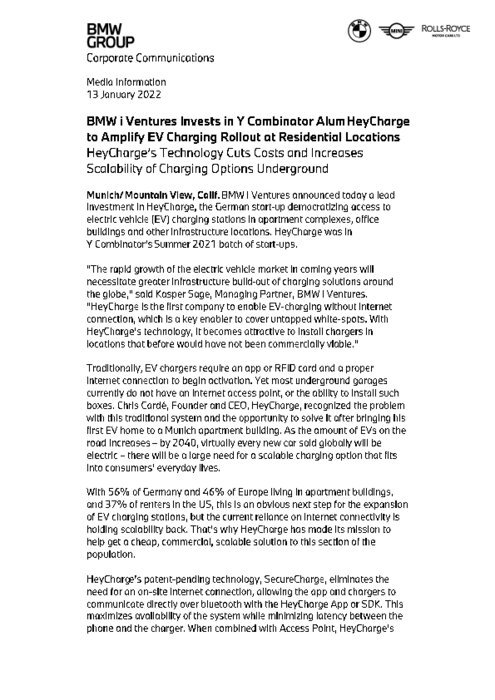 Constructeurs 13 janvier 2022 - 14:03 BMW i Ventures investit dans HeyCharge, un alumni de l’accélérateur Y Combinator, afin d'amplifier le déploiement de la recharge des voitures électriques dans les zones résidentielles. PDF (606 Ko) Télécharger