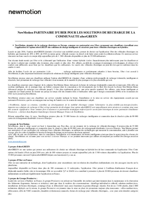 NewMotion, pionnier de la recharge électrique en Europe, annonce un partenariat avec Uber, proposant aux chauffeurs travaillant avec l'application et l'option uberGREEN des solutions de charge intelligente et sécurisée pour leurs véhicules électriques ou hybrides.