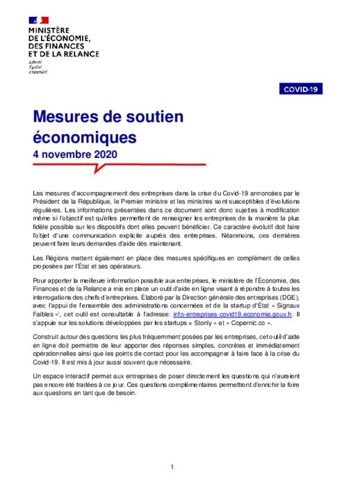 Par ailleurs, le Ministère de l’Economie et des Finances a mis en place un outil d’aide en ligne visant à répondre à toutes les interrogations des chefs d’entreprises : http://info-entreprises-Covid-19.economie.gouv.fr