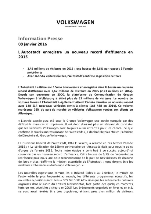 L'Autostadt a célébré son 15ème anniversaire et enregistré dans la foulée un nouveau record d’affluence avec 2,42 millions de visiteurs en 2015 (2,23 millions en 2014). Depuis son ouverture en 2000, la plateforme de Communication du Groupe Volkswagen à Wolfsbourg a attiré plus de 33 millions de visiteurs. Le nombre de voitures livrées à l'Autostadt a également atteint l’année dernière un nouveau record avec 168 514 nouveaux véhicules remis à clients (166 488 en 2014).
