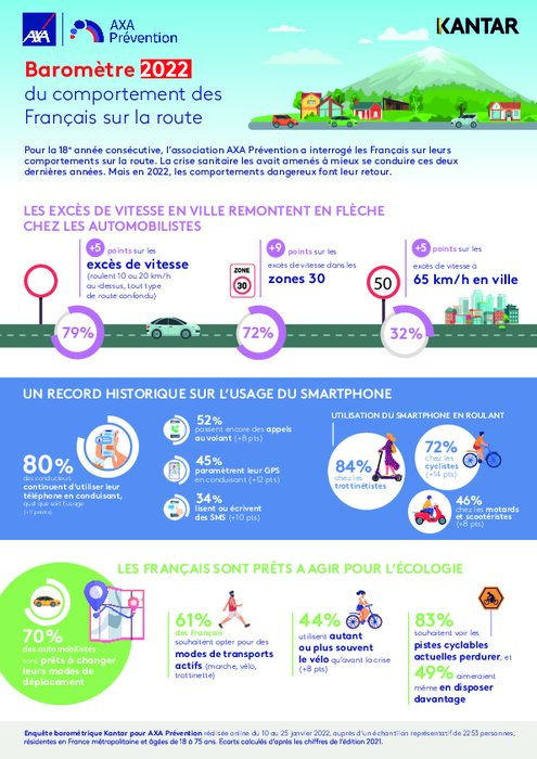 Par ailleurs, 72% des automobilistes (+ 9 pts) disent rouler à une vitesse comprise entre 40 ou 50 km/h dans les zones limitées à 30 km/h en ville, de plus en plus généralisées, et 32% (+ 5 pts) à plus de 65 km/h en ville.