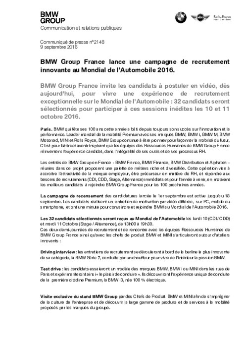 BMW Group France invite les candidats à postuler en vidéo, dès aujourd’hui, pour vivre une expérience de recrutement exceptionnelle sur le Mondial de l’Automobile : 32 candidats seront sélectionnés pour participer à ces sessions inédites les 10 et 11 octobre 2016.