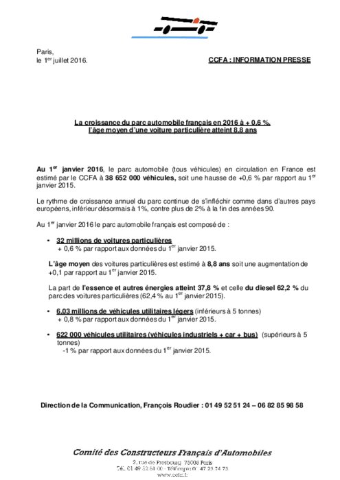 Selon le CCFA, la France comptait au 1er janvier 32 millions de voitures particulières (+0,6% sur un an) dont l'âge moyen s'établissait à 8,8 ans (+0,1 point).