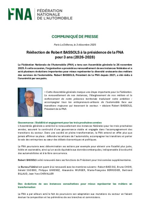 La Fédération Nationale de l’Automobile (FNA) a tenu son Assemblée générale le 26 novembre. À cette occasion, l’organisation a procédé au renouvellement de ses instances fédérales et a acté plusieurs évolutions importantes pour mieux représenter la diversité croissante des métiers des services de l’automobile. Robert Bassols, Président de la FNA depuis 2021, a été réélu à l’unanimité par ses pairs.
