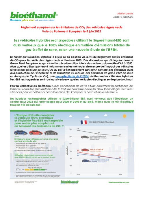 Alors que le Parlement Européen statuera le 8 juin sur sa position vis-à-vis du Règlement sur les émissions de CO2 pour les véhicules légers neufs à l’horizon 2035, la collective du bioéthanol dévoile dans une étude de l’IFPEN que les véhicules hybrides rechargeables utilisant le Superéthanol-E85 sont aussi vertueux que le 100% électrique en matière d’émissions totales de gaz à effet de serre.