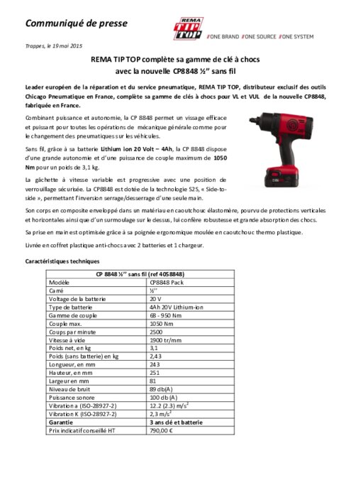 Leader européen de la réparation et du service pneumatique, REMA TIP TOP, distributeur exclusif des outils Chicago Pneumatique en France, complète sa gamme de clés à chocs pour VL et VUL de la nouvelle CP8848, fabriquée en France. Combinant puissance et autonomie, la CP 8848 permet un vissage efficace et puissant pour toutes les opérations de mécanique générale comme pour le changement des pneumatiques sur les véhicules.