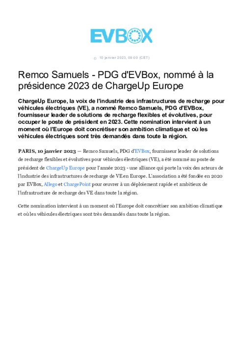 ChargeUp Europe, la voix de l'industrie des infrastructures de recharge pour véhicules électriques (VE), a nommé Remco Samuels, PDG d'EVBox, fournisseur leader de solutions de recharge flexibles et évolutives, pour occuper le poste de président en 2023. Cette nomination intervient à un moment où l'Europe doit concrétiser son ambition climatique et où les véhicules électriques sont très demandés dans toute la région.