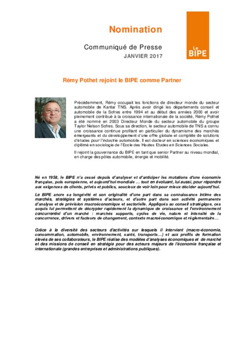 Rémy occupait les fonctions de directeur monde du secteur automobile de Kantar TNS. Après avoir dirigé les départements conseil et automobile de la Sofres entre 94 et au début des années 2000, Rémy Pothet a été nommé en 2003 Directeur Monde du secteur automobile du groupe Taylor Nelson Sofres. Il rejoint la gouvernance du BIPE en tant que senior Partner au niveau mondial, en charge des pôles automobile, énergie et mobilité.