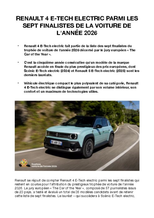 Renault se réjouit de compter Renault 4 E-Tech electric parmi les sept finalistes qui restent en course pour l'attribution du prestigieux trophée de voiture de l'année 2026. Le jury européen « The Car of the Year », composé de 57 journalistes issus de 23 pays, a testé et évalué un total de 35 modèles candidats avant de retenir cette liste de sept finalistes. Le lauréat – qui succèdera à Scénic E-Tech electric, titré en 2024 et à Renault 5 E-Tech electric et Alpine A290, titrées en 2025 – sera dévoilé le 9 janvier 2026 au Brussels Motor Show.