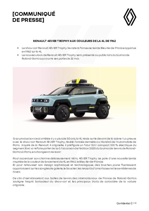 Constructeurs 12 mai 2023 - 08:46 Le show-car Renault 4EVER Trophy revisite la fameuse teinte Bleu Ile-de-France apparue en 1962 sur la 4L. Le nouveau look de Renault 4EVER Trophy sera présenté au public lors du tournoi de Roland-Garros qui ouvre ses portes le 22 mai. PDF (364 Ko) Télécharger