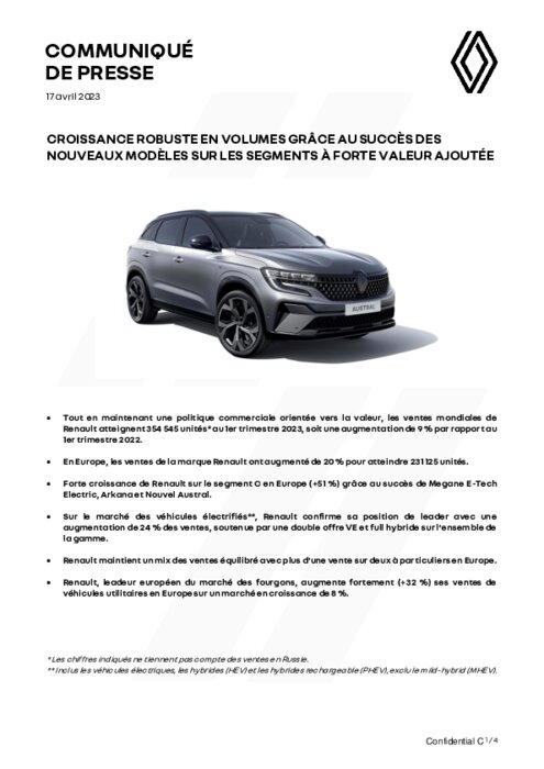 Tout en maintenant sa politique commerciale tournée vers la valeur, Renault enregistre des ventes mondiales de 354 545 unités* (VP et VU), soit une augmentation de 9 % par rapport au 1er trimestre 2022. En Europe, Renault atteint une part de marché de 6,2 % (+0,2 point vs T1 2022) avec 231 125 unités (VP+VU). Comme en 2022, la marque enregistre des progrès significatifs dans les segments à forte valeur ajoutée.
