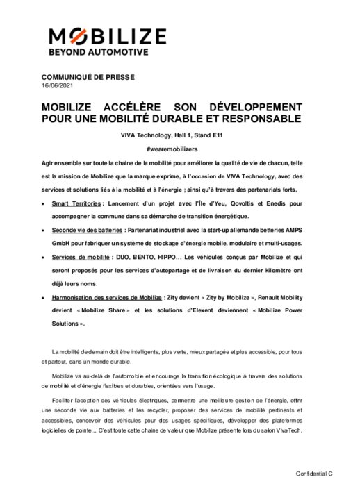 Agir ensemble sur toute la chaine de la mobilité pour améliorer la qualité de vie de chacun, telle est la mission de Mobilize que la marque exprime, à l’occasion de VIVA Technology, avec des services et solutions liés à la mobilité et à l’énergie ; ainsi qu’à travers des partenariats forts.