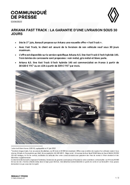 Dès le 1er juin, Renault propose sur Arkana une nouvelle offre « Fast Track ». Avec Fast Track, le client est assuré de la livraison de son véhicule neuf sous 30 jours maximum. L’offre est disponible sur la version spécifique Arkana R.S. line Fast Track E-Tech hybride 145. Trois teintes de carrosserie sont proposées : noir métal, gris métal et blanc perle. Arkana R.S. line Fast Track E-Tech hybride 145 est commercialisé en France à partir de 38 630 € TTC ou en LOA à partir de 339 € TTC par mois