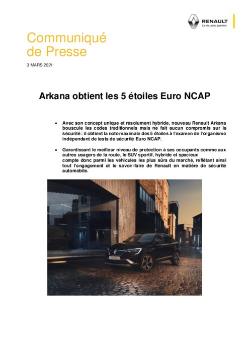 Constructeurs 03 mars 2021 - 11:20 Nouveau Renault Arkana fait partie du cercle des véhicules les plus sûrs, en obtenant la note maximale des 5 étoiles Euro NCAP. PDF (256 Ko) Télécharger