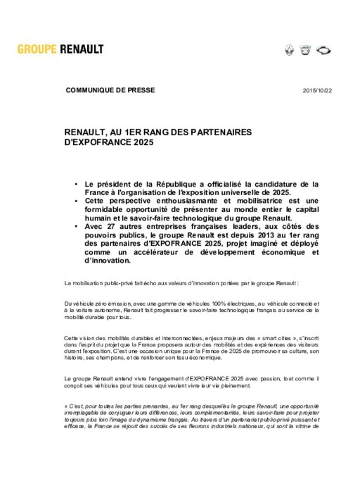Le président de la République a officialisé la candidature de la France à l'organisation de l'exposition universelle de 2025. Cette perspective enthousiasmante et mobilisatrice est une formidable opportunité de présenter au monde entier le capital humain et le savoir-faire technologique du groupe Renault. Avec 27 autres entreprises françaises leaders, aux côtés des pouvoirs publics, le groupe Renault est depuis 2013 au 1er rang des partenaires d'EXPOFRANCE 2025.