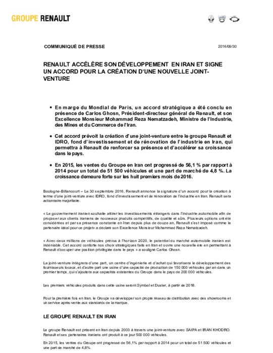 Le groupe au losange et la République islamique ont en effet signé en marge du Mondial de l'automobile, à Paris, un "accord stratégique" pour la création d'une nouvelle joint-venture en Iran, selon un communiqué.