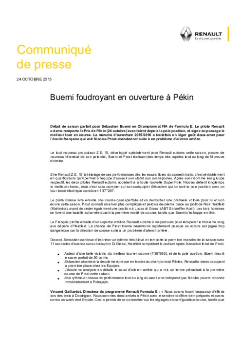 Début de saison parfait pour Sébastien Buemi en Championnat FIA de Formula E. Le pilote Renault e.dams remporte l’ePrix de Pékin (24 octobre) avec talent depuis la pole position, et signe au passage le meilleur tour en course. La manche d’ouverture 2015/2016 a toutefois un léger goût doux-amer pour l’écurie française qui voit Nicolas Prost abandonner suite à un problème d’aileron arrière.