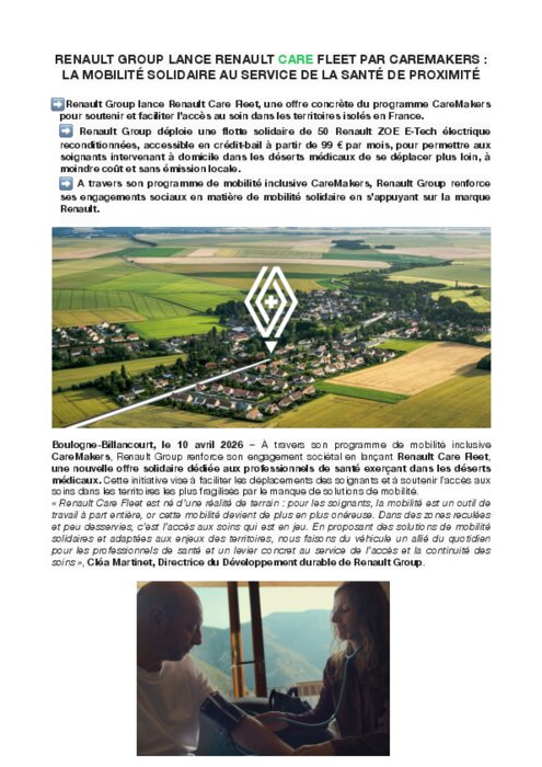 À travers son programme de mobilité inclusive CareMakers, Renault Group renforce son engagement sociétal en lançant Renault Care Fleet, une nouvelle offre solidaire dédiée aux professionnels de santé exerçant dans les déserts médicaux. Cette initiative vise à faciliter les déplacements des soignants et à soutenir l’accès aux soins dans les territoires les plus fragilisés par le manque de solutions de mobilité.