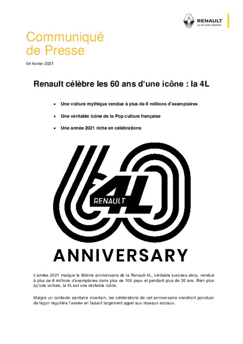 L’année 2021 marque le 60ème anniversaire de la Renault 4L, véritable success-story, vendue à plus de 8 millions d’exemplaires dans plus de 100 pays et pendant plus de 30 ans. Bien plus qu’une voiture, la 4L est une véritable icône. Malgré un contexte sanitaire incertain, les célébrations de cet anniversaire viendront ponctuer de façon régulière l’année en faisant largement appel aux réseaux sociaux.