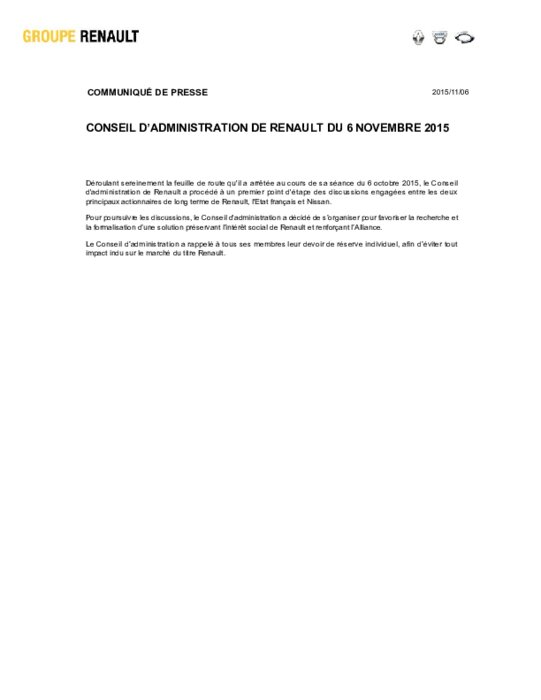 Déroulant sereinement la feuille de route qu'il a arrêtée au cours de sa séance du 6 octobre 2015, le Conseil d'administration de Renault a procédé à un premier point d'étape des discussions engagées entre les deux principaux actionnaires de long terme de Renault, l’État français et Nissan.