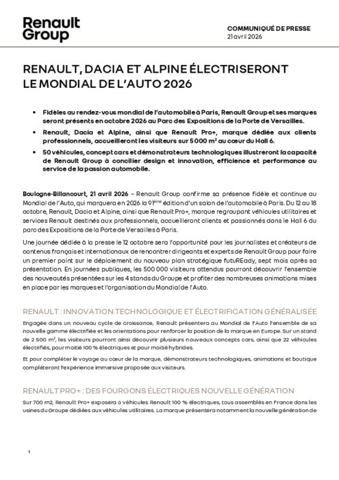 Constructeurs 21 avril 2026 - 10:21 Fidèles au rendez-vous mondial de l'automobile à Paris, Renault Group et ses marques seront présents en octobre 2026 au Parc des Expositions de la Porte de Versailles. PDF (101 Ko) Télécharger credit Paris Motor Show