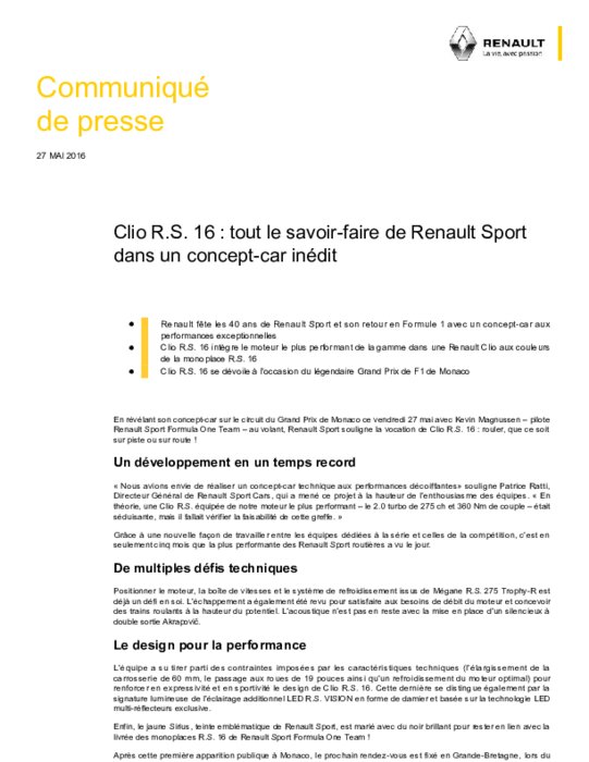 Renault fête les 40 ans de Renault Sport et son retour en Formule 1 avec un concept-car aux performances exceptionnelles. Clio R.S. 16 intègre le moteur le plus performant de la gamme dans une Renault Clio aux couleurs de la monoplace R.S. 16. Clio R.S. 16 se dévoile à l’occasion du légendaire Grand Prix de F1 de Monaco.