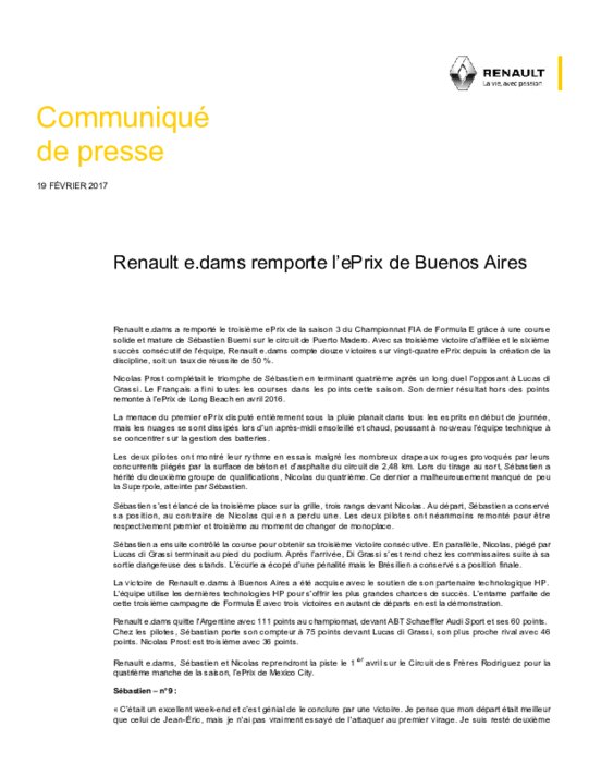 Renault e.dams a remporté le troisième ePrix de la saison 3 du Championnat FIA de Formula E grâce à une course solide et mature de Sébastien Buemi sur le circuit de Puerto Madero. Avec sa troisième victoire d’affilée et le sixième succès consécutif de l'équipe, Renault e.dams compte douze victoires sur vingtquatre ePrix depuis la création de la discipline, soit un taux de réussite de 50 %.