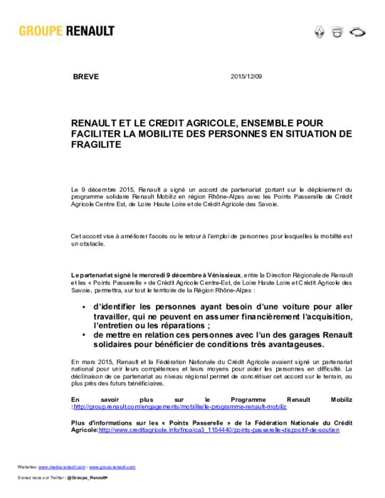 Le 9 décembre 2015, Renault a signé un accord de partenariat portant sur le déploiement du programme solidaire Renault Mobiliz en région Rhône-Alpes avec les Points Passerelle de Crédit Agricole Centre Est, de Loire Haute Loire et de Crédit Agricole des Savoie. Cet accord vise à améliorer l’accès ou le retour à l’emploi de personnes pour lesquelles la mobilité est un obstacle.