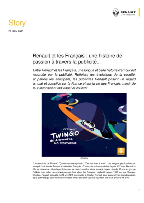Entre Renault et les Français, une longue et belle histoire d'amour est racontée par la publicité. Reflétant les évolutions de la société, et parfois les anticipant, les publicités Renault posent un regard amusé et complice sur la France et sur la vie des Français, miroir de leur inconscient individuel et collectif.