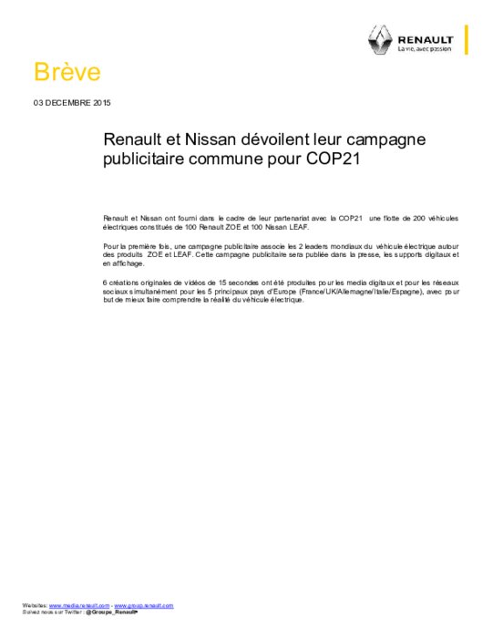 Constructeurs 03 décembre 2015 - 14:02 Renault et Nissan ont fourni dans le cadre de leur partenariat avec la COP21 une flotte de 200 véhicules électriques constitués de 100 Renault ZOE et 100 Nissan LEAF. PDF (83 Ko) Télécharger