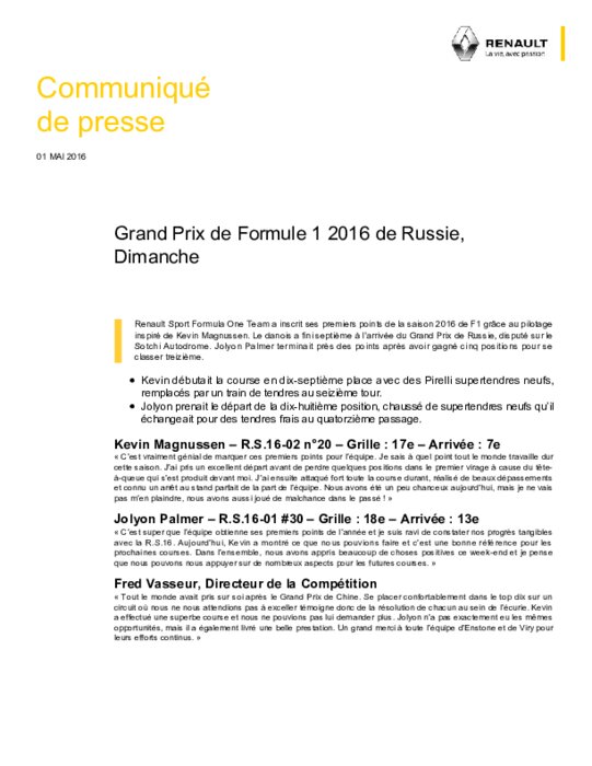 Renault Sport Formula One Team a inscrit ses premiers points de la saison 2016 de F1 grâce au pilotage inspiré de Kevin Magnussen. Le danois a fini septième à l’arrivée du Grand Prix de Russie, disputé sur le Sotchi Autodrome. Jolyon Palmer terminait près des points après avoir gagné cinq positions pour se classer treizième.