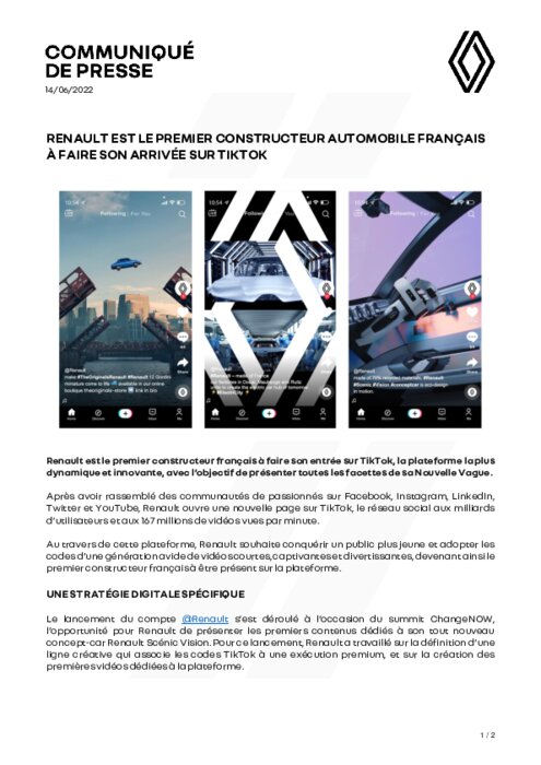 Renault est le premier constructeur français à faire son entrée sur TikTok, la plateforme la plus dynamique et innovante, avec l’objectif de présenter toutes les facettes de sa Nouvelle Vague.