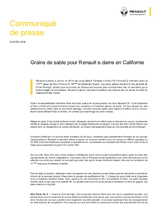 Renault e.dams a connu un ePrix de Long Beach Faraday Future FIA Formula E frustrant avec la 11ème place de Nico Prost et la 16ème de Sébastien Buemi. Les deux pilotes écopent d’une pénalité de drive-through, tandis que la course du Suisse est encore plus compromise par un accident qui a endommagé sa monoplace. Renault e.dams maintient toutefois une avance de six points en tête du classement des Teams.