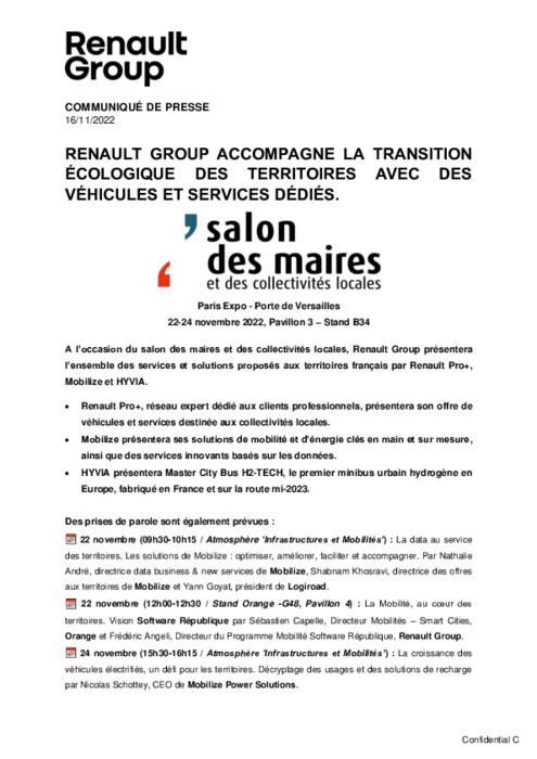 A l’occasion du salon des maires et des collectivités locales, Renault Group présentera l’ensemble des services et solutions proposés aux territoires français par Renault Pro+, Mobilize et HYVIA. Renault Pro+, réseau expert dédié aux clients professionnels, présentera son offre de véhicules et services destinée aux collectivités locales. Mobilize présentera ses solutions de mobilité et d’énergie clés en main et sur mesure, ainsi que des services innovants basés sur les données.