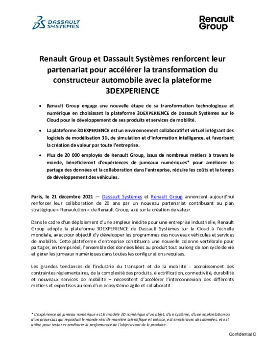 Renault Group engage une nouvelle étape de sa transformation technologique et numérique en choisissant la plateforme 3DEXPERIENCE de Dassault Systèmes sur le Cloud pour le développement de ses produits et services de mobilité. La plateforme 3DEXPERIENCE est un environnement collaboratif et virtuel intégrant des logiciels de modélisation 3D, de simulation et d’information intelligence, et favorisant la création de valeur par toute l’entreprise.