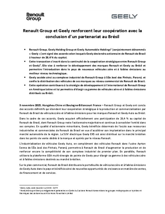 Renault Group et Geely ont conclu des accords définitifs qui étendent leur coopération stratégique à la production et commercialisation par Renault do Brasil de véhicules zéro et à faibles émissions pour les marques Renault et Geely Auto au Brésil.