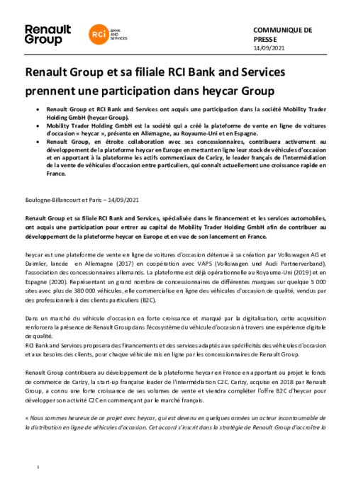 Renault Group et sa filiale RCI Bank and Services, spécialisée dans le financement et les services automobiles, prennent une participation pour entrer au capital de Mobility Trader Holding afin de contribuer au développement de la plateforme heycar en Europe et en vue de son lancement en France.
