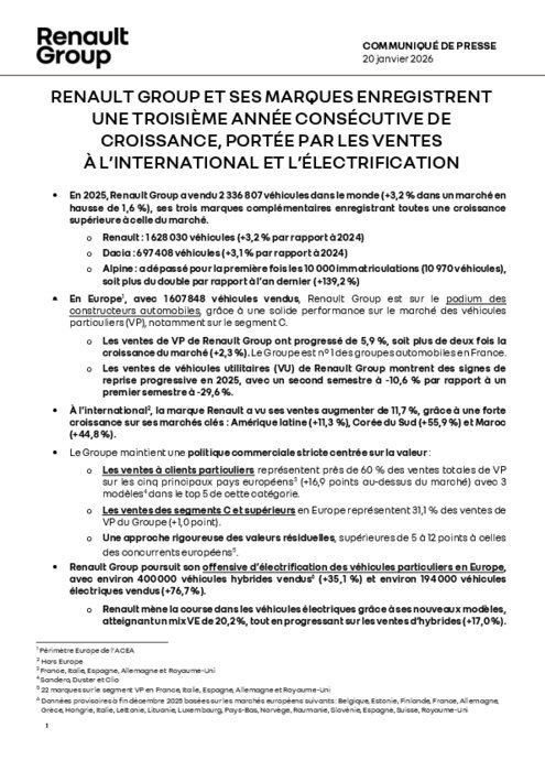 Constructeurs 20 janvier 2026 - 10:27 En 2025, Renault Group a vendu 2 336 807 véhicules dans le monde (+3,2 % dans un marché en hausse de 1,6 %), ses trois marques complémentaires enregistrant toutes une croissance supérieure à celle du marché. PDF (252 Ko) Télécharger credit Renault