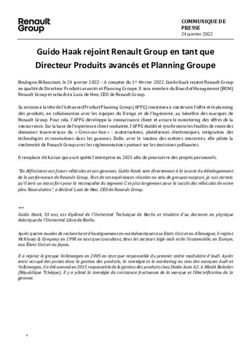 A compter du 1er février 2022, Guido Haak rejoint Renault Group en qualité de Directeur Produits avancés et Planning Groupe. Il sera membre du Board of Management (BOM) Renault Group et rattaché à Luca de Meo, CEO de Renault Group.