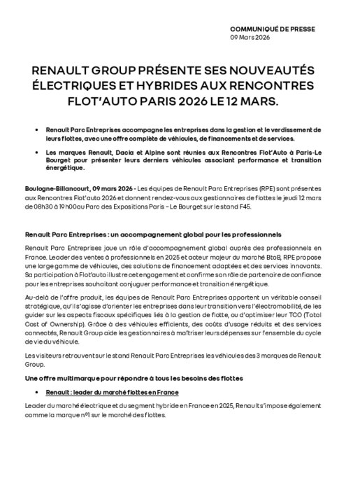 Constructeurs 09 mars 2026 - 16:32 Renault Parc Entreprises accompagne les entreprises dans la gestion et le verdissement de leurs flottes, avec une offre complète de véhicules, de financements et de services. PDF (125 Ko) Télécharger credit Renault