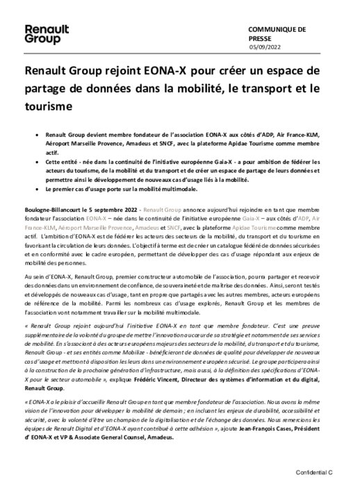 Renault Group annonce aujourd’hui rejoindre en tant que membre fondateur l’association EONA-X – née dans le continuité de l’initiative européenne Gaia-X – aux côtés d’ADP, Air France-KLM, Aéroport Marseille Provence, Amadeus et SNCF, avec la plateforme Apidae Tourisme comme membre actif. L’ambition d’EONA-X est de fédérer les acteurs des secteurs de la mobilité, du transport et du tourisme en favorisant la circulation de leurs données.