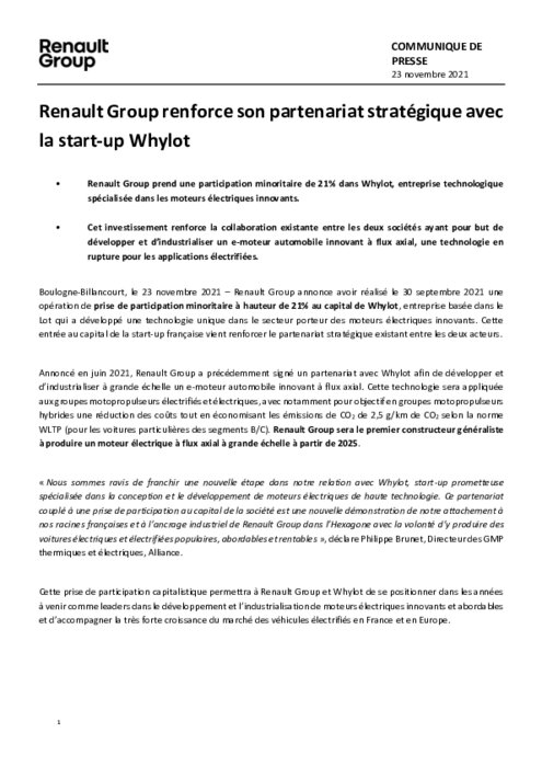Renault Group annonce avoir réalisé le 30 septembre 2021 une opération de prise de participation minoritaire à hauteur de 21% au capital de Whylot, entreprise basée dans le Lot qui a développé une technologie unique dans le secteur porteur des moteurs électriques innovants. Cette entrée au capital de la start-up française vient renforcer le partenariat stratégique existant entre les deux acteurs.