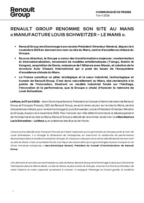 Constructeurs 07 avril 2026 - 14:54 Renault Group rend hommage à son ancien Président-Directeur Général, disparu le 6 novembre 2025 en donnant son nom au site du Mans, centre d'excellence châssis du Groupe. PDF (189 Ko) Télécharger Renault