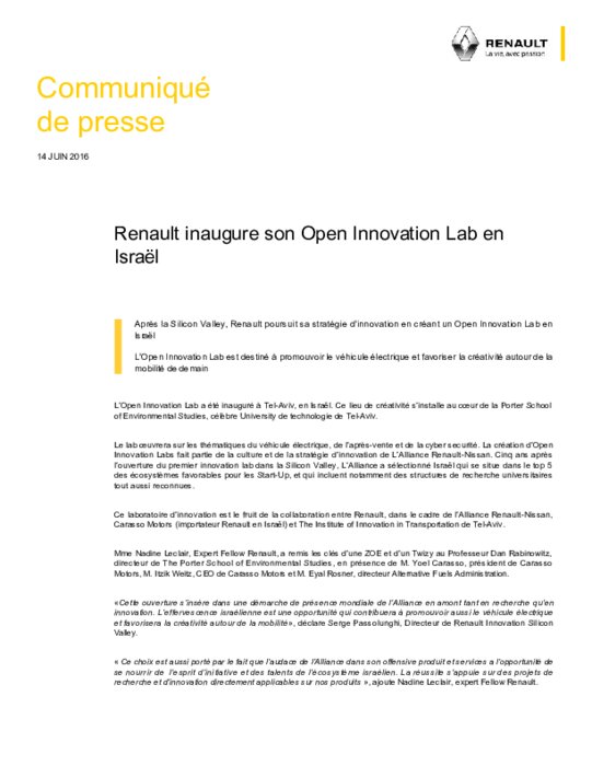 Après la Silicon Valley, Renault poursuit sa stratégie d’innovation en créant un Open Innovation Lab en Israël. L’Open Innovation Lab est destiné à promouvoir le véhicule électrique et favoriser la créativité autour de la mobilité de demain. L’Open Innovation Lab a été inauguré à Tel-Aviv, en Israël. Ce lieu de créativité s’installe au cœur de la Porter School of Environmental Studies, célèbre University de technologie de Tel-Aviv.