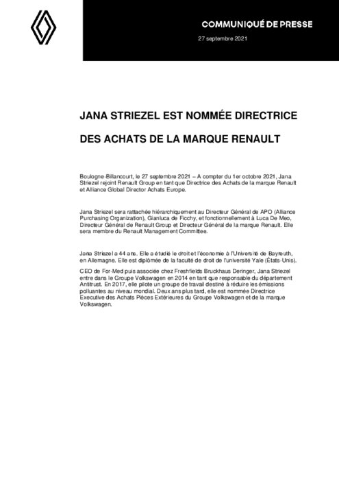 A compter du 1er octobre 2021, Jana Striezel rejoint Renault Group en tant que Directrice des Achats de la marque Renault et Alliance Global Director Achats Europe. Jana Striezel sera rattachée hiérarchiquement au Directeur Général de APO (Alliance Purchasing Organization), Gianluca de Ficchy, et fonctionnellement à Luca De Meo, Directeur Général de Renault Group et Directeur Général de la marque Renault. Elle sera membre du Renault Management Committee.